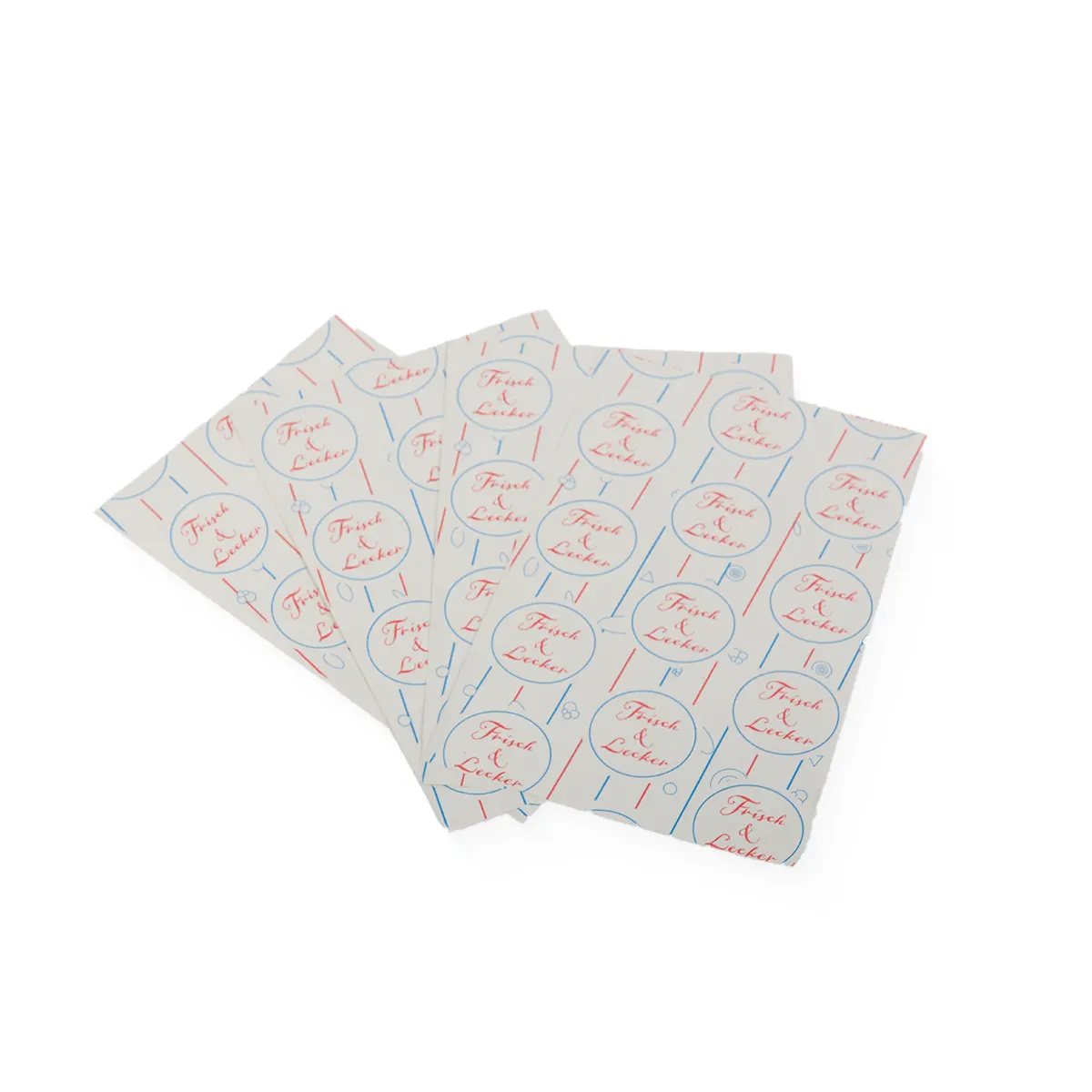 Wie bei Duplexpapier üblich, ist es vollflächig mit einer HDPE-Folie kaschiert. Diese Innenseite bietet eine 100% zuverlässige Barriere gegen Fett und Feuchtigkeit. Das Format 25 x 37 cm ist ein gängiger Thekenzuschnitt. Die Außenseite ist ansprechend 2-farbig mit dem Motiv „Frisch und lecker“ bedruckt.