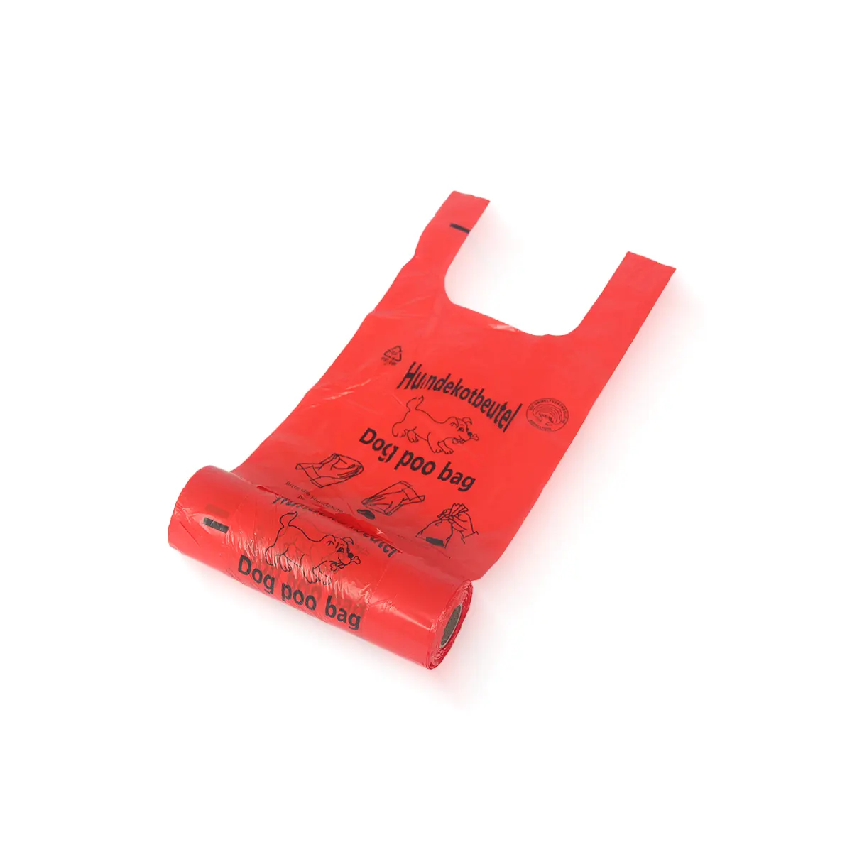 Hundekotbeutel auf Rolle mit Henkeln aus Recycling-HDPE in Signalrot, Format 20 x 40 cm. Extra starke 15 my Qualität, 200 Beutel pro Rolle mit Papierkern. VE: 4.000 Stück (20 Rollen).