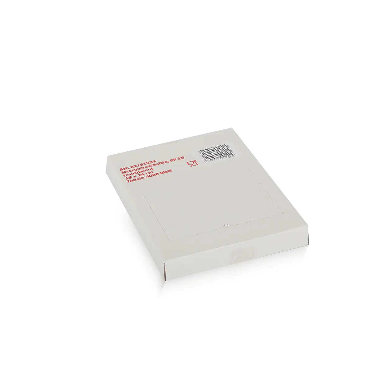 Glasklare PP-Zuschnitte im Format 18 x 24 cm (1/16 Bogen) für professionelle Anwendungen an Frischetheke, Konditorei und Lebensmittelproduktion. Fettdicht, wasserabweisend und hygienisch verpackt in Spenderboxen. VE: 20.000 Blatt.